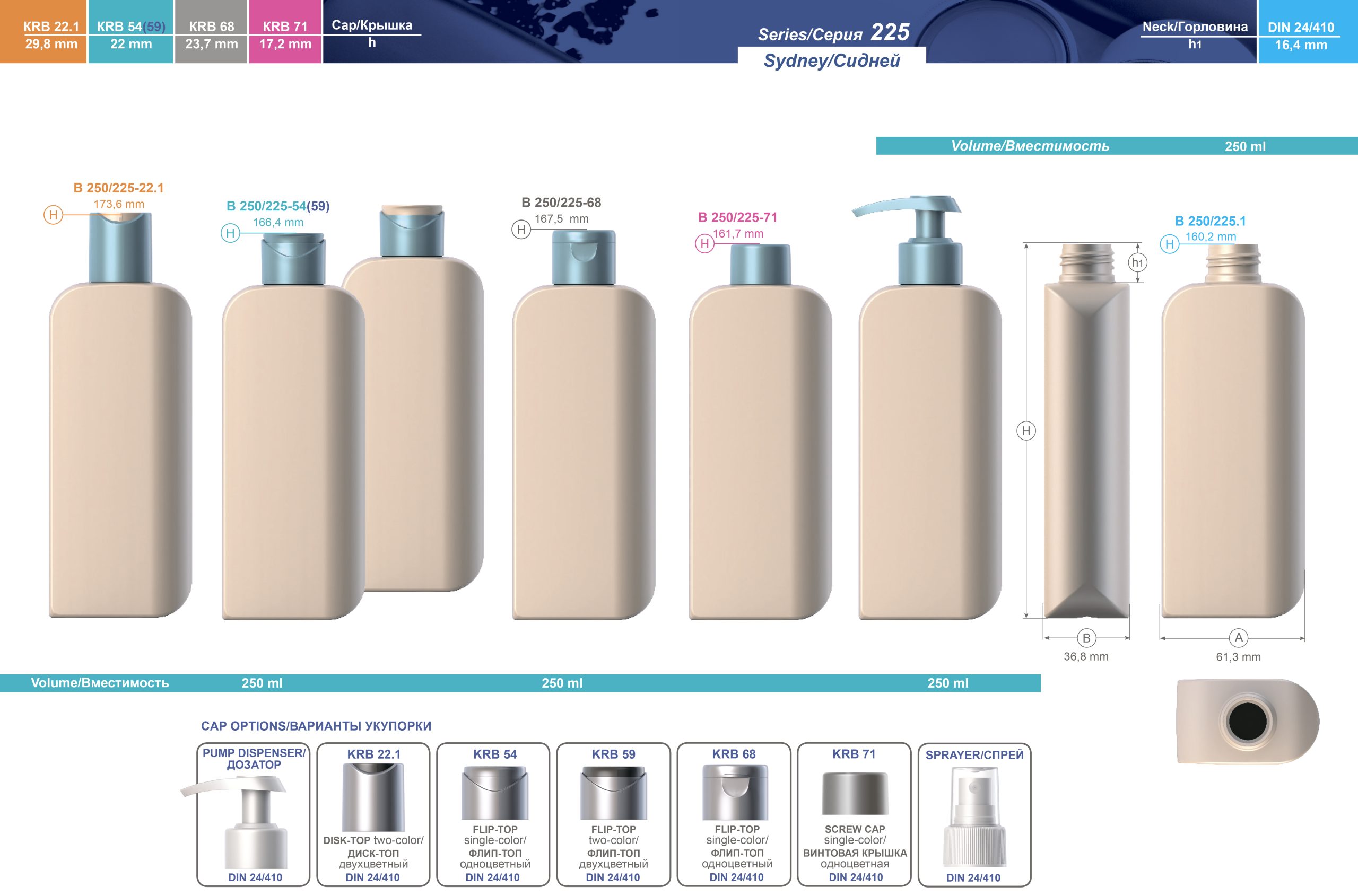 Bottle B250/225-22.1, B250/225-54(59), B250/225-68, B250/225-71, B250/225.1 with a flip-top cap KRB54, KRB59, KRB68, screw KRB71 or for pump dispenser DIN 24/410.