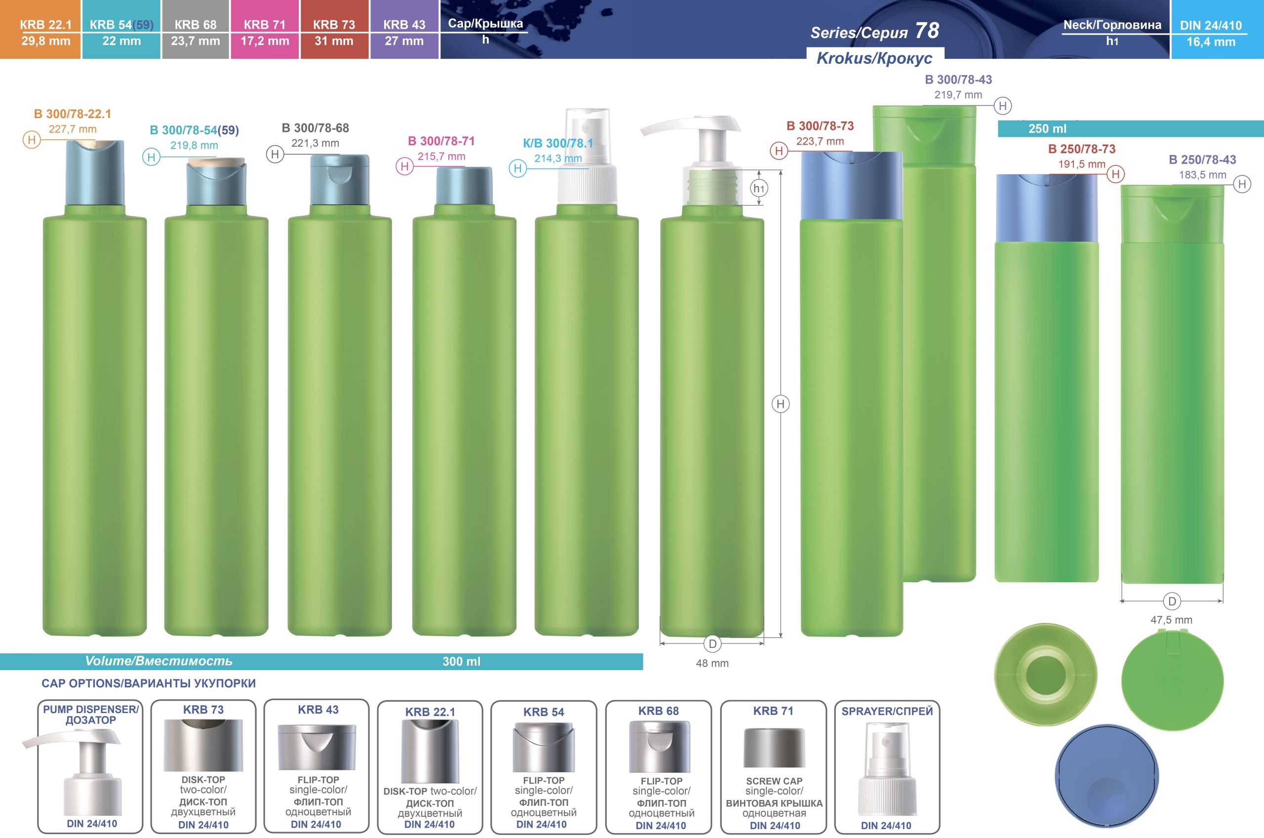Bottle B300/78 with caps flip-top KRB23, flip-top KRB43, disk-top KRB22, flip-top KRB39 and with spray.