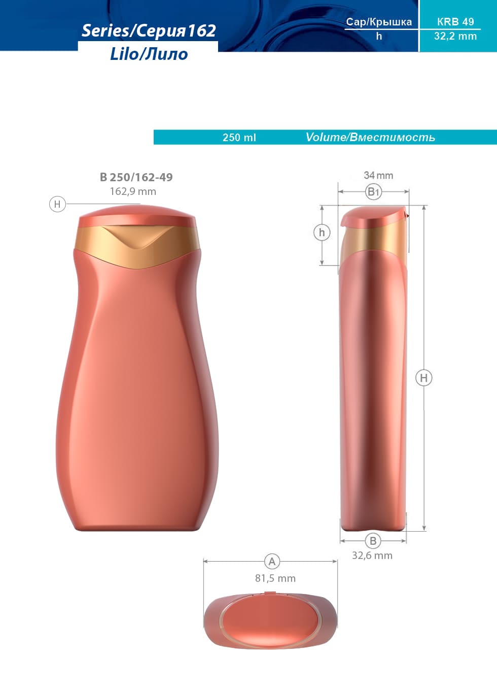 Пластиковый флакон B250/162-49 с крышкой флип-топ KRB49 отлично подойдет для шампуней, гелей для душа, в т.ч. косметических средств детской серии.