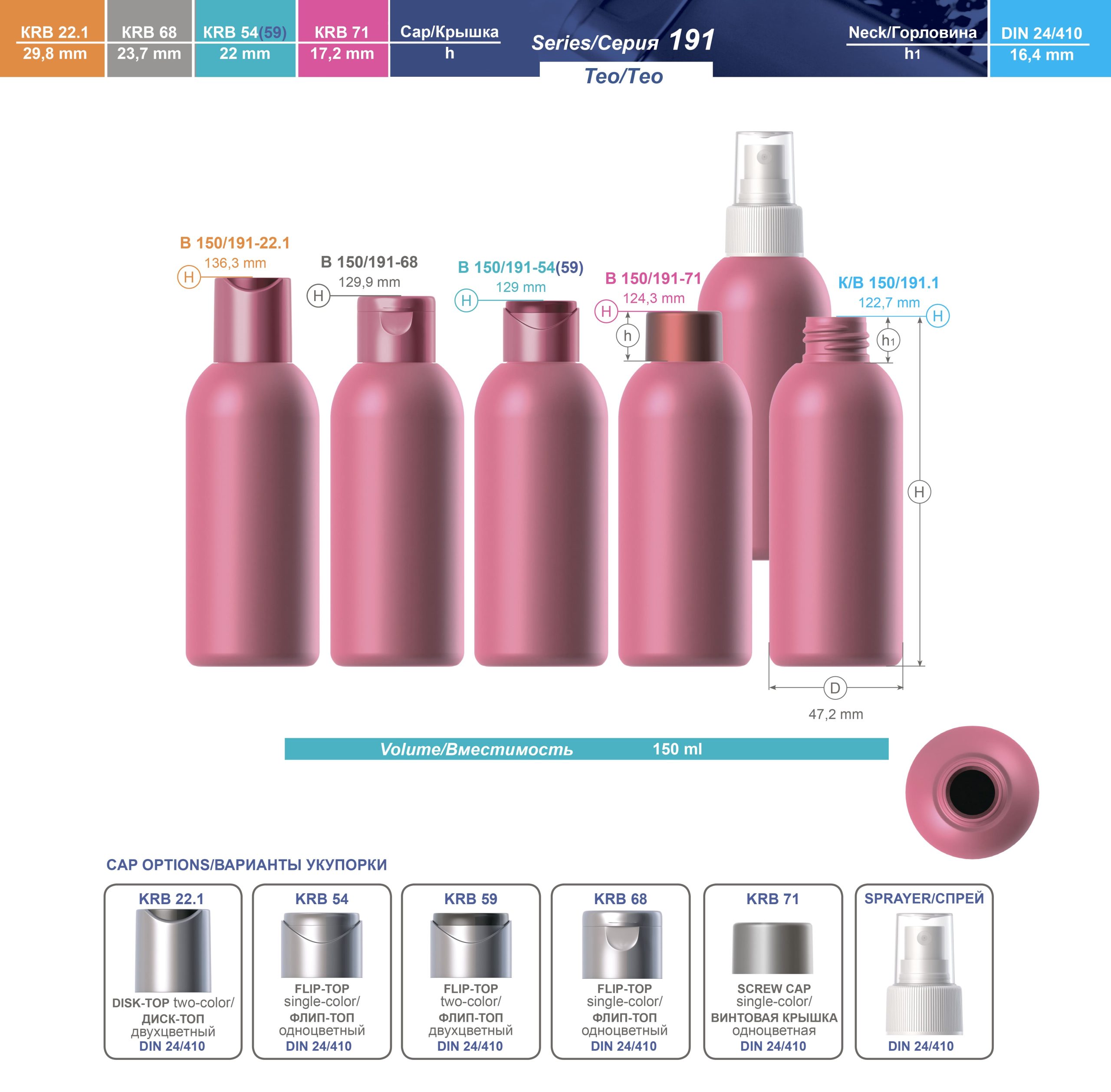 Флаконы B 150/191-54, B 150/191-59, B 150/191-22.1, B 150/191-68, B 150/191-71 с крышками флип-топ и диск-топ.