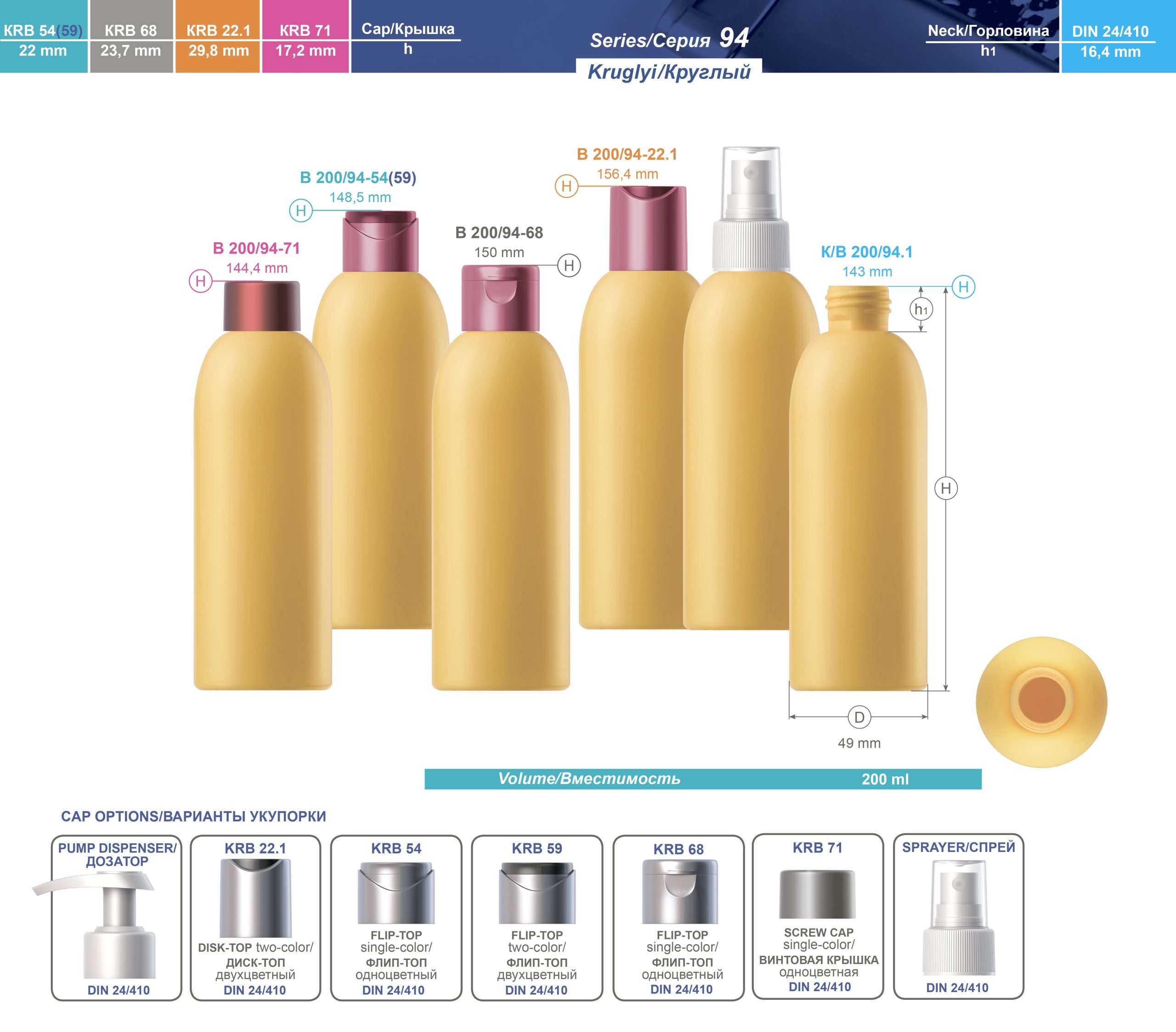 Флаконы B 200/94-54 с двухцветнойкрышкой флип-топ KRB54 со стандартной резьбой.